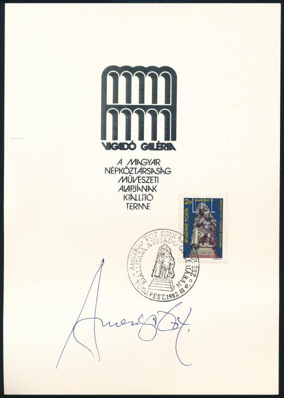 1982 Amerigo Tot (1909-1984) szobrászművész aláírása a Vigadó Galériában rendezett kiállításának emléklapján, alkalmi bélyegzéssel