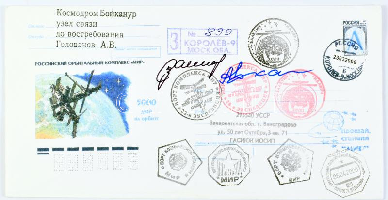 Alekszandr Kaleri (1956- ) Szergej Zaljotin (1962- ) orosz űrhajósok aláírásai sorszámozott emlékborítékon / Signatures of Aleksandr Kaleri (1956- ), Sergei Zalyotin (1962- ) Russian astronauts on limited, numbered envelope