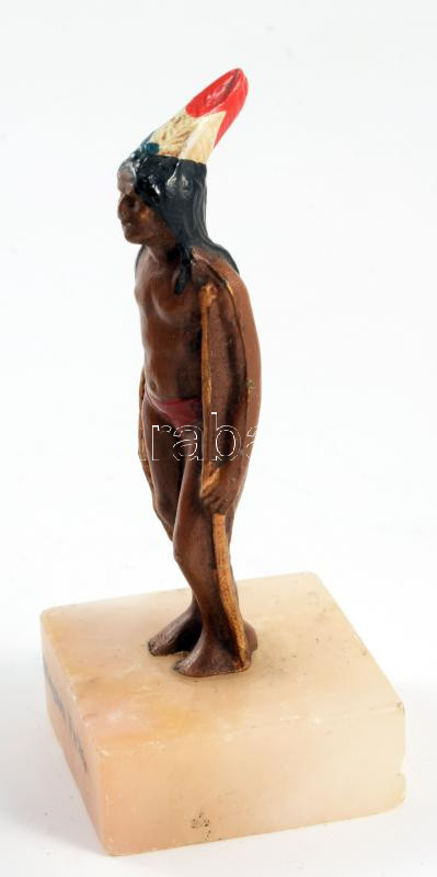 Festett fém indián szobor, talapzaton, m: 10 cm