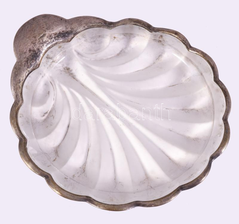 Kagylós ezüstözött fém tálka, üvegbetéttel, a betéten apró lepattanással, 12x10,5 cm