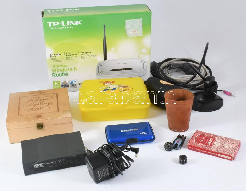 Vegyes bolha tétel: TP-Link Wireless Router, mikrofon, Piatnik magyar kártya, bőr kockapohár és dobókockák, uzsonnás doboz, stb.