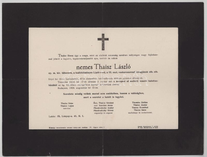 1928 Bp., nemes Thaisz László (1861-1928) nyug. m. kir. tábornok, a Lipót-rend és a III. oszt. Vaskorona-rend lovagja, az I. világháborúban a verseci 2. honvéd tábori ágyúsezred tagjának halotti értesítője, apró lapszéli sérülésekkel, 23x30 cm