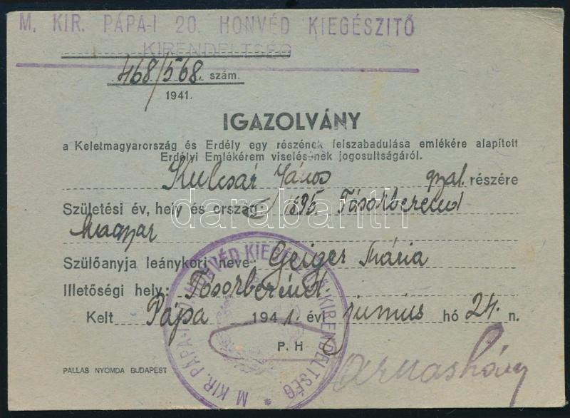 1941 Pápa, Erdélyi Emlékérem viselésére jogosító igazolvány, M. kir. pápai 20. honvéd kiegészítő kirendeltség