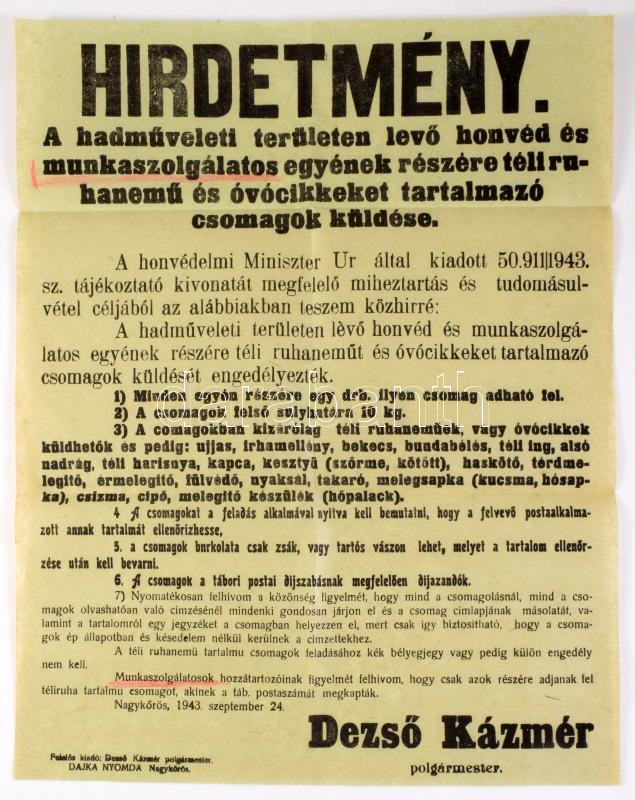 1943 Nagykőrös hirdetmény a hadműveleti területen lévő honvéd és munkaszolgáltoso egének részére téli ruhanemű és óvócikkeket tartalmazó csomagok küldése. 30x40 cm