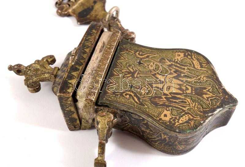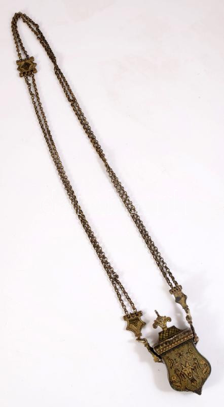 Antik fém gyufatartó(?), láncon, 8x4 cm, lánccal h: 40 cm
