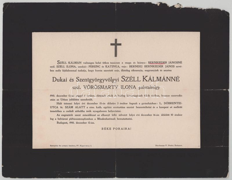 1910 Bp., Széll Kálmánné, szül. Vörösmarty Ilona (1844-1910) palotahölgy, dukai és szentgyörgyvölgyi Széll Kálmán (1843-1915) országgyűlési képviselő, miniszterelnök feleségének halotti értesítője, lapszéli sérülésekkel, 24x31 cm