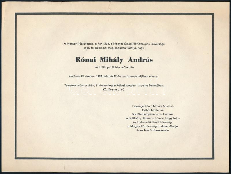 1992 Bp., Rónai Mihály András író, költő, publicista, műfordító halálozási értesítője, kisebb lapszéli sérüléssel, 20x26,5 cm