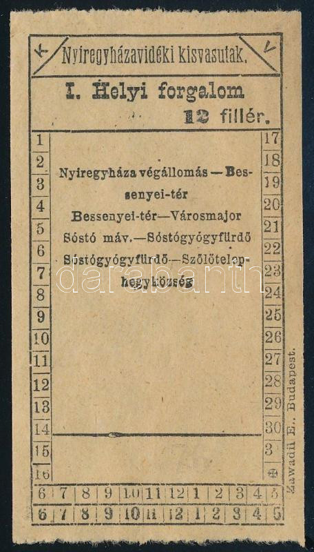 1915 Nyíregyházavidéki kisvasutak 12 filléres helyi forgalmi jegye a megállók nevével, szép állapotban
