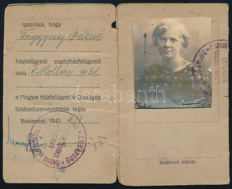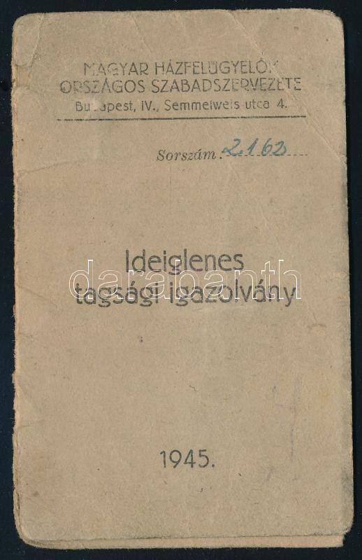 1945 Bp., Magyar Házfelügyelők Országos Szabadszervezete ideiglenes tagsági igazolvány, fényképes