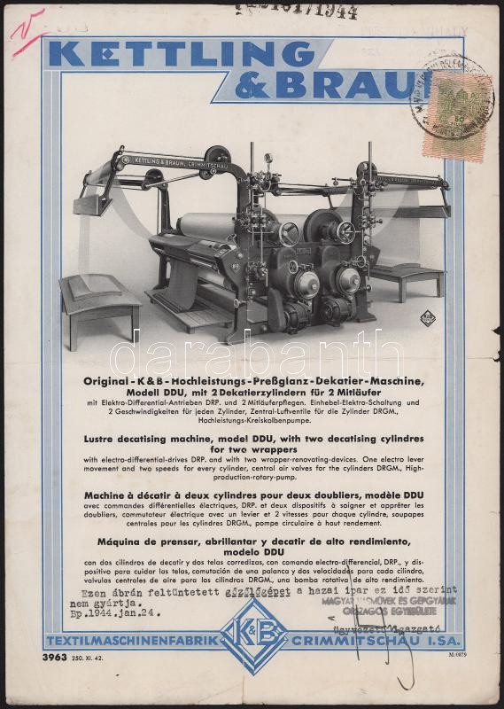 1942-1944 Kettling & Braun és Mipsa műszaki ismertető szórólapok, 2 db, hajtott, szakadásokkal