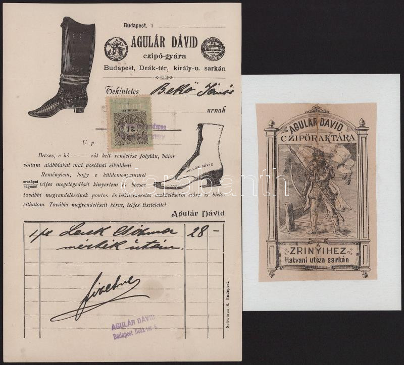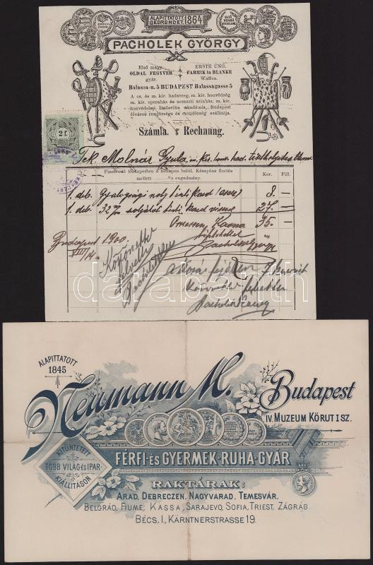 ca 1870-1900 4 db grafikus, fejléces számla, Pacholek György oldalfegyvergyár, Agulár Dávid cipőgyár, stb