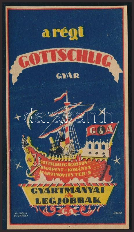 cca 1930-1940 Gottschlig Ágoston számolócédula, 'A régi Gottschlig gyár gyártmányai a legjobbak', Globus Bp., Kozma Lajos (1884-1948) építész, grafikus, iparművész által tervezett számolócédula, 12x6 cm