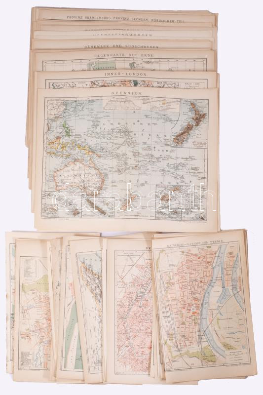 cca 1900 Vegyes térkép-mellékletek a Brockhaus Konversations-Lexikonból, összesen 44 db, változó állapotban, 25x15 cm és 25x32 cm között