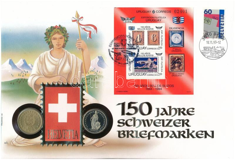 Uruguay 1965. 10P "Artigas" + Svájc 1993. 2Fr érmés borítékon egy elsőnapi bélyegzős uruguay-i bélyegblokkal valamint egy alkalmi bélyegzős svájci bélyeggel; ismertetővel T:UNC-PP