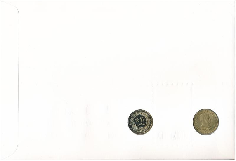 Uruguay 1965. 10 Pesos "Artigas" + Svájc 1993. 2 Francs on a coin envelope with a first day cancellation Uruguayan stamp block and a Swiss stamp, with a description C:UNC-PP