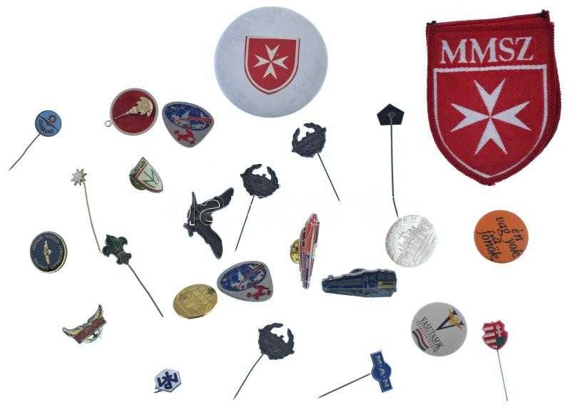 Vegyes 25db jelvényből + 2db felvarróból álló tétel, közte Magyar Máltai Szeretetszolgálat, illetve több vasutas témájú jelvény T:vegyes