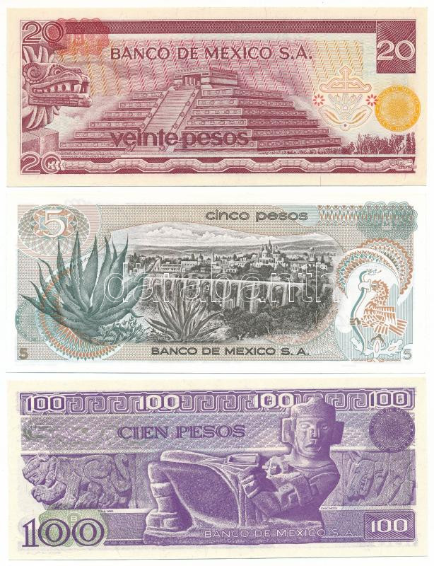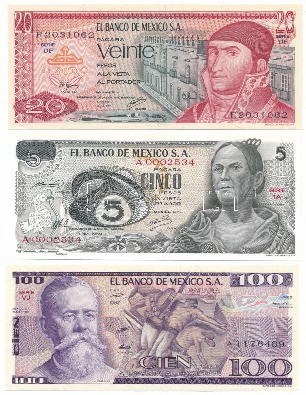 Mexico 1969. 5 Pesos + 1977. 20 Pesos + 1982. 100 Pesos C:UNC-AU
