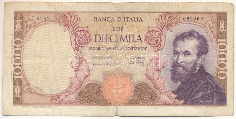 Italy 1962. 10.000 Lire "Michelangelo" "L 0257 062262" C:F,VG