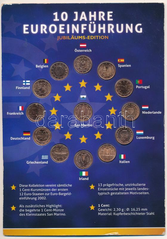Europian Union 2004-2010. 1 Cent bronze (13xdiff) "10 Jahre euroeinführung" in original cardboard packing C:UNC