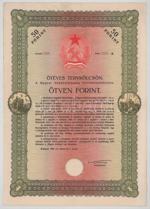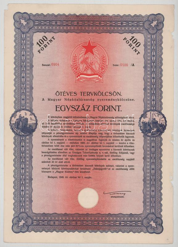 1949. Budapest "Ötéves tervkölcsön - A Magyar Népköztársaság nyereménykölcsöne" 50Ft-ról, "1306 0239 /A" sorszámmal, szárazpecséttel + "Ötéves tervkölcsön - A Magyar Népköztársaság nyereménykölcsöne" 100Ft-ról, "0904 0186 /A" sorszámmal, szárazpecséttel T:XF,VF mindkettő kis anyaghiány