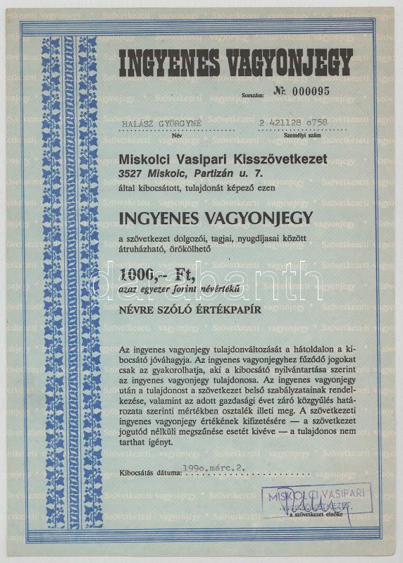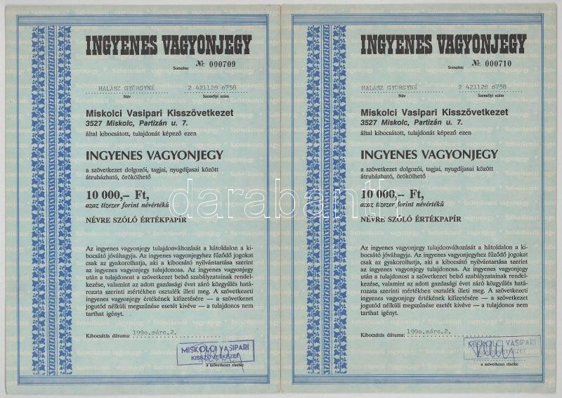 1990. "Miskolci Vasipari Kisszövetkezet" névre szóló ingyenes vagyonjegye 10.000Ft-ról (3x) T:AU