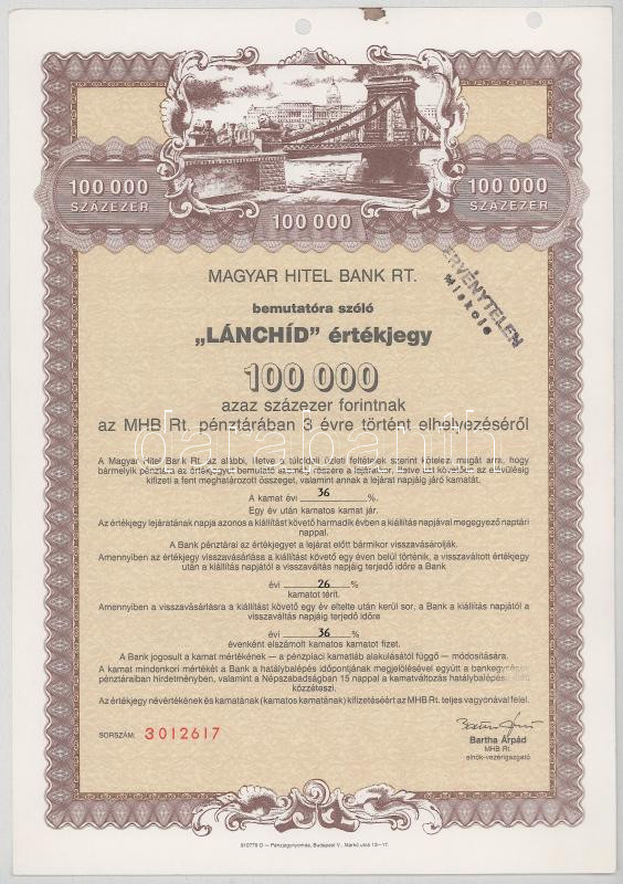 1991. Miskolc "Magyar Hitel Bank Rt. 'Lánchíd' értékjegy" 5000Ft-ról, bélyegzésekkel, lyukasztásokkal érvénytelenítve (2x) sorszámkövetők + "Magyar Hitel Bank Rt. 'Lánchíd' értékjegy" 100.000Ft-ról, bélyegzésekkel, lyukasztásokkal érvénytelenítve T:AU,XF egyiken fo.