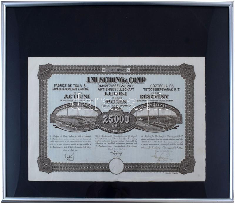 Románia / Lugos 1925. "J. Muschong & Comp Gőztégla-És Tetőcserépgyárak Rt." részvény 25.000L-ről "02501-02525", keretezve T:XF