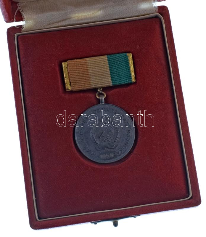 1955. "A Magyar Népköztársaság Bajnoka - 1955 / OTSB (Országos Testnevelési és Sportbizottság)" kétoldalas fém ökölvívó díjjelvény szalagon, gravírozással, eredeti Rákosi-címeres tokban (30mm) T:AU patina
