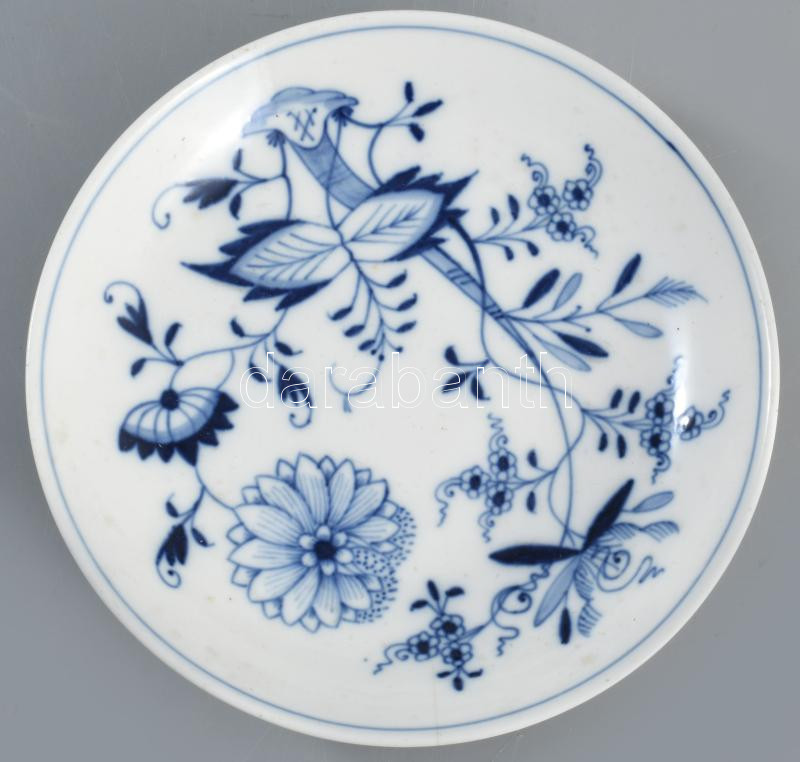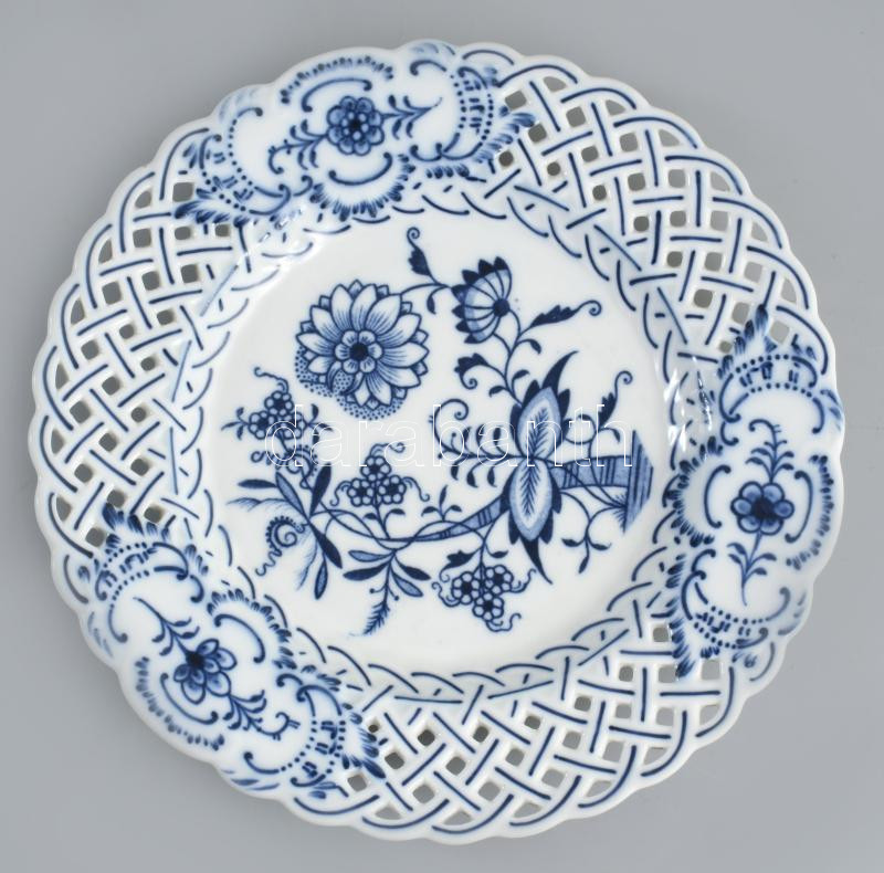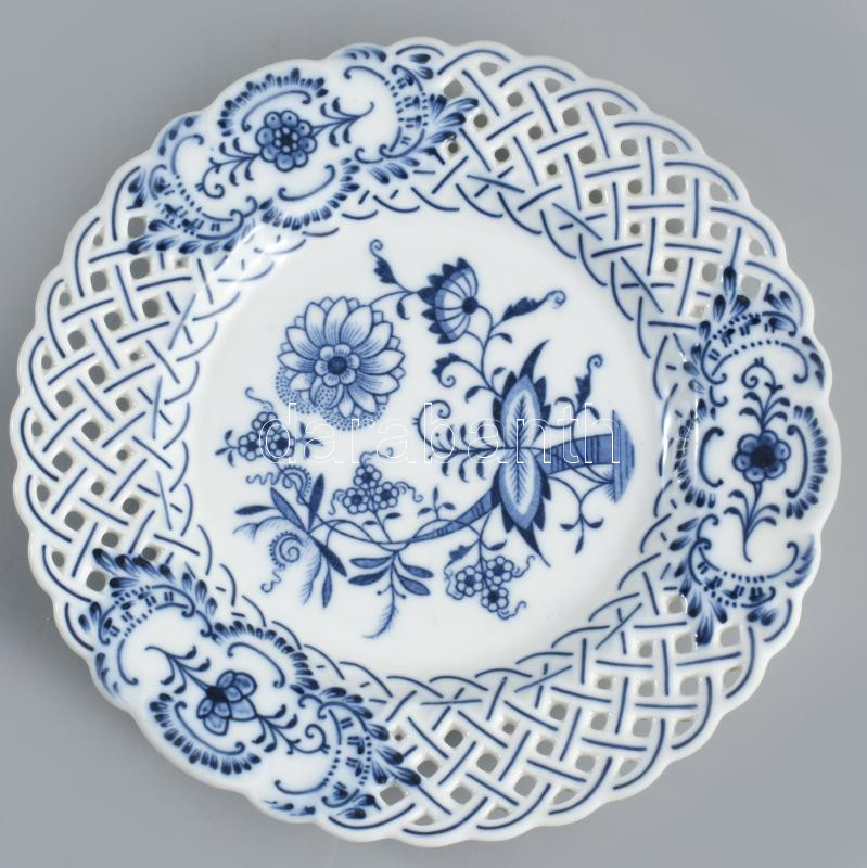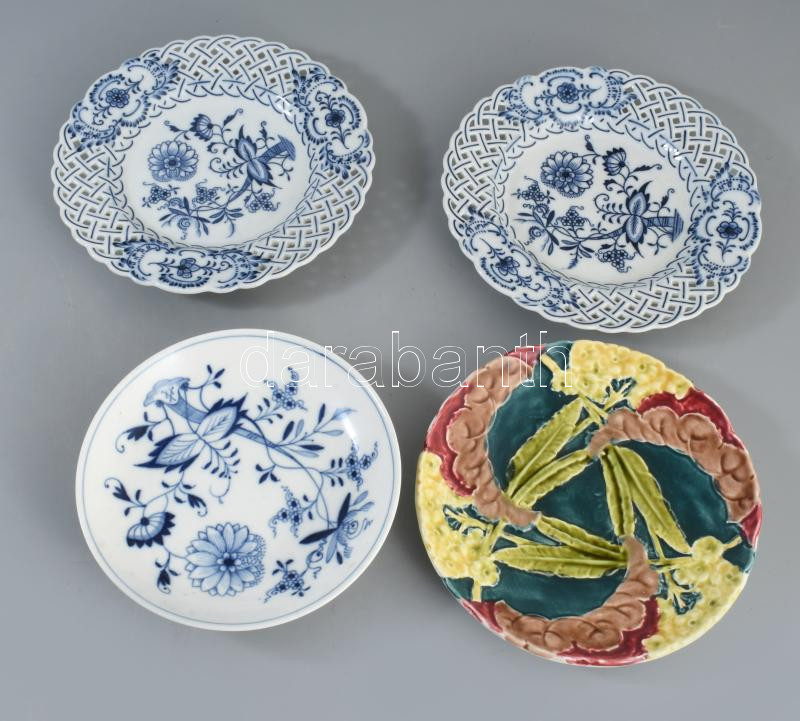 4 darab porcelán és fajansz tál, közte Meissen máz alatti kobaltkék hagymamintával festett áttört dísztál