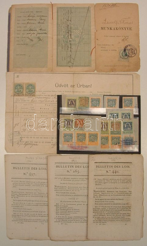 Leírás: 1800-1900 Okmány- és okmánybélyeg-tétel, részben kivágások, közte Munkakönyv ill. Útlevél