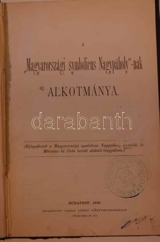 A "Magyarországi Symbolicus Nagypáholy"-nak alkotmánya https://www.darabanth.com/hu/52-Gyorsarveres/52.0/Festmeny-mutargy-papirregiseg-egyeb/Okmany-Documents~239/A-Magyarorszagi-Symbolicus-Nagypaholy-nak-alkotmanya~II92448