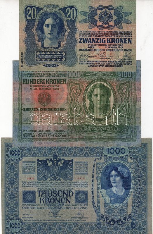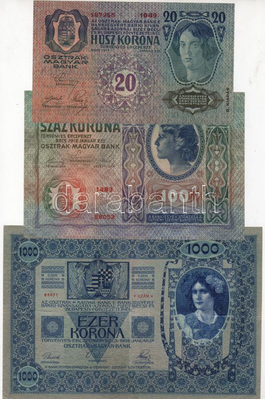 Leírás: 1902. 1000K T:II+ + 1912. 100K T:II+ + 1913. 20K II.kiadás T:II+ parányi szakadással. Mindegyik csak egyszer hajtva!