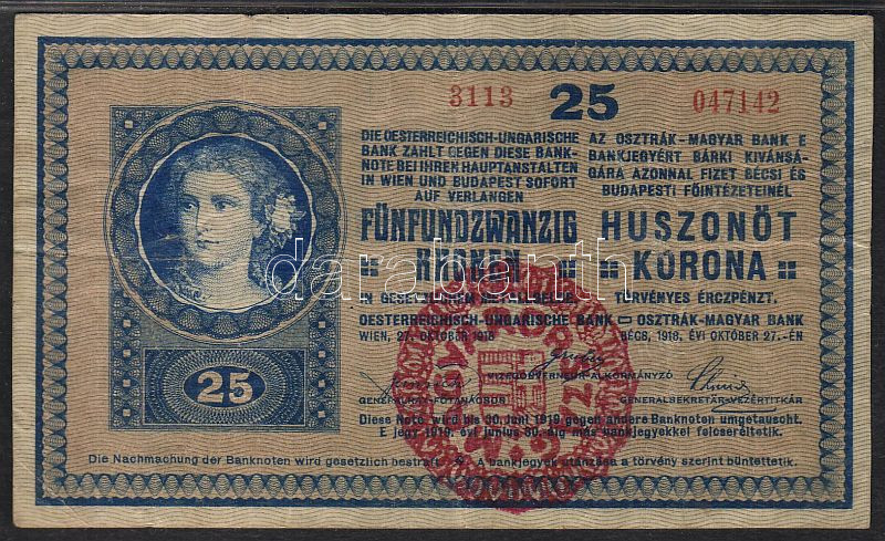 1918. 25K hamis piros "Magyarország" körbélyegzővel T:II https://www.darabanth.com/hu/52-Gyorsarveres/52.0/Numizmatika/NUMIZMATIKA-NUMISMATICS~247/1918-25K-hamis-piros-Magyarorszag-korbelyegzovel-TII~II102710