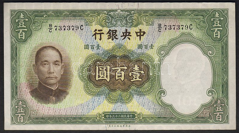 Kína/Central Bank 1936. 100Y T:I https://www.darabanth.com/hu/52-Gyorsarveres/52.0/Numizmatika/NUMIZMATIKA-NUMISMATICS~247/KinaCentral-Bank-1936-100Y-TI~II102595