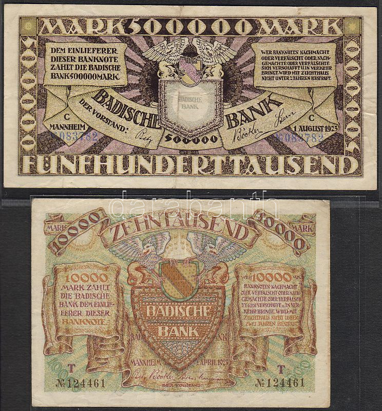 Német Birodalom/Baden 1923. 10.000M, 500.000M T:II https://www.darabanth.com/hu/52-Gyorsarveres/52.0/Numizmatika/NUMIZMATIKA-NUMISMATICS~247/Nemet-BirodalomBaden-1923-10000M-500000M-TII~II102544