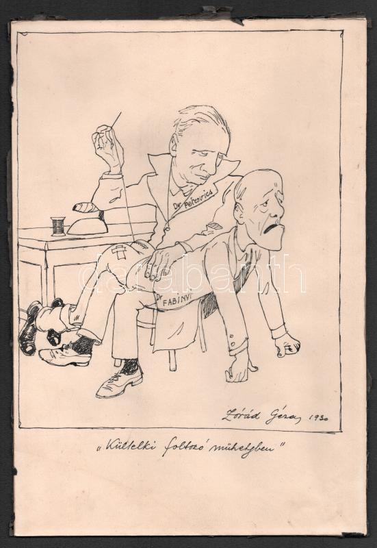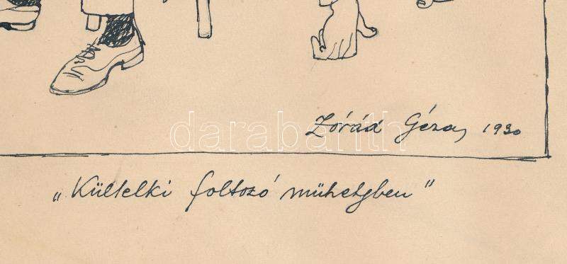 Zórád Géza (1882-1961): "Kültelki foltozó műhelyben" (karikatúra), 1930. Tus, papír, jelzett, kartonon, 31×21,5 cm