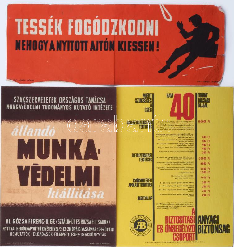 cca 1950-1970 Vegyes plakát tétel, 3 db: Állandó Munkavédelmi kiállítás, "Tessék fogódzkodni nehogy a nyitott ajtón kiessen!", "ÁB A Biztosítási és Önsegélyező Csoport anyagi biztonság", az utóbbi hajtott, sérült, 10x27 cm, 21x14 cm