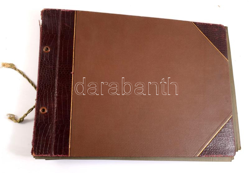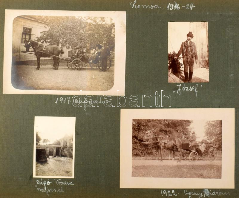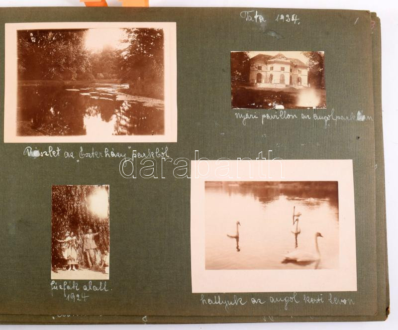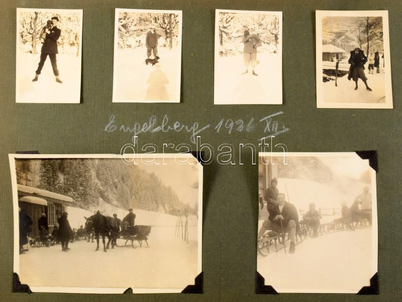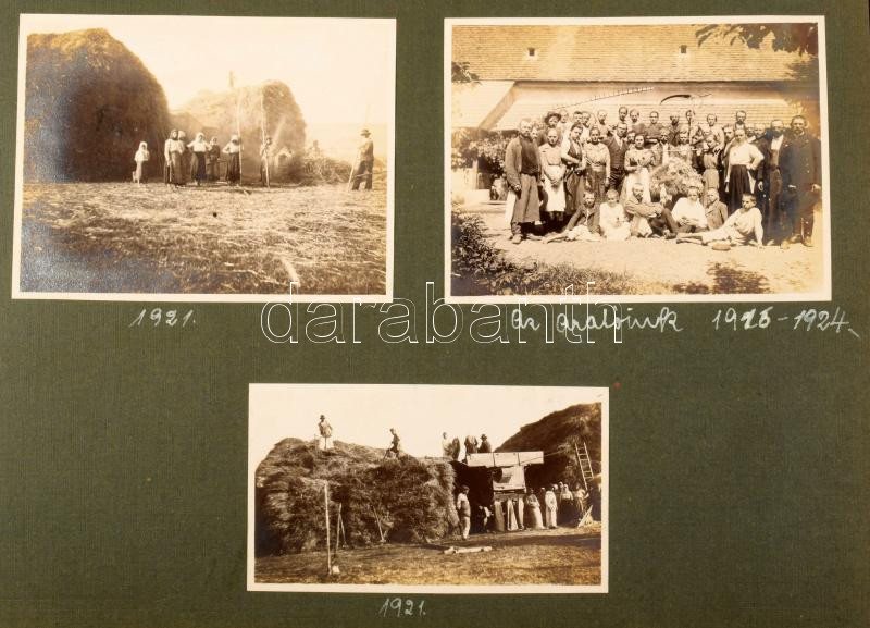 1916-1926 Tata Tóváros, Szomód, Esterházy birtok, aratás Fotóalbum kb 30 db feliratozott fotóval az előbbi környékekről + kb 10 képeslap ugyanebben a témában + 40 fotó 1926 síelés, aranylakodalom, Engelberg, Lovran témával, Fotóalbumban.