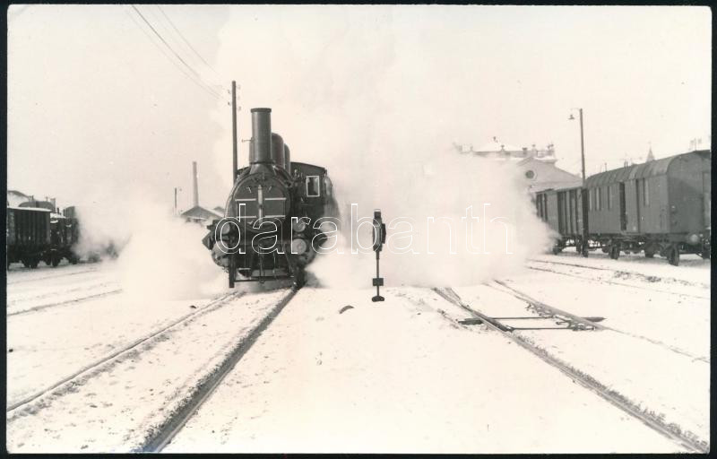 Sopron, érkező mozdony a Déli pályaudvaron, pecséttel jelzett fotó, Tóth Sándor felvétele, 9×14 cm
