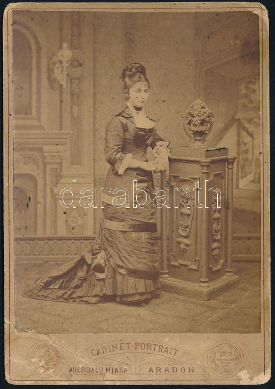 cca 1875 Hölgy egész alakos műtermi portréja, keményhátú fotó Auerbach Miksa aradi műterméből, sérült, 16,5×10,5 cm
