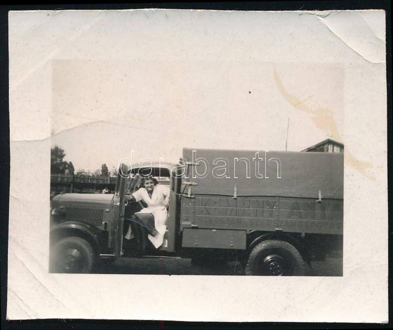 cca 1938 Budapest X. Kemény Antal Szerszám és Szerszámgépgyár Rt. teherautója, kisméretű fotó, felületén törésnyomok, 4×5 cm