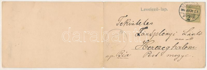 1904 Csák, Csákova, Ciacova; Fő tér, piac, Micsa Testvérek, Schönborn Gyula, J. Pantits, Mesterovits & Jovánovits üzlete. 2- részes kinyitható panorámalap / main square, market, shops. 2-tiled folding panoramacard (hajtásnál kis szakadás / bent til broken)