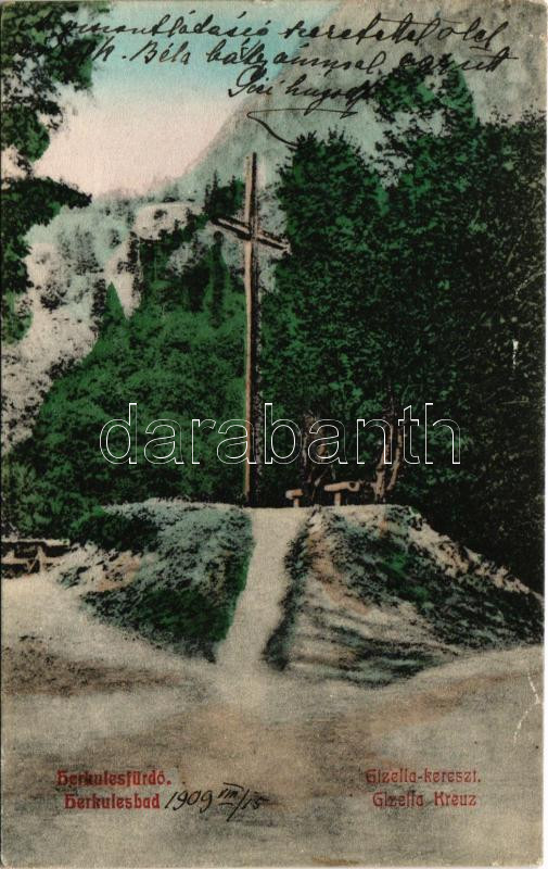 1909 Herkulesfürdő, Baile Herculane; Gizella kereszt. Deixner Fanny kiadása / Gisella-Kreuz / cross, monument (ázott / wet damage)