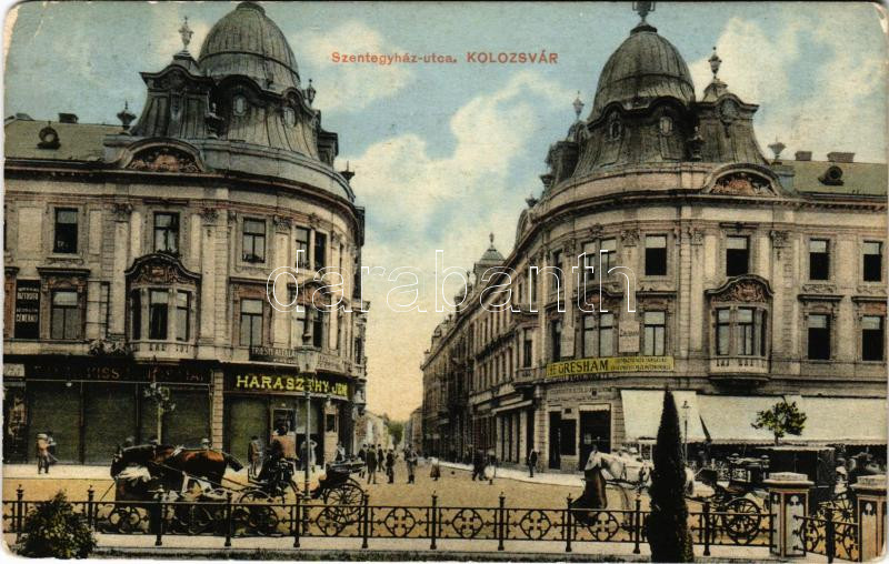1913 Kolozsvár, Cluj; Szentegyház utca, Státus paloták, Triesti Általános Biztosító, The Gresham Életbiztosító társaság, Haraszthy Jenő és Frank Kiss János és fiai üzlete. Bernát kiadása / street view with insurance companies and shops (kis szakadás / small tear)