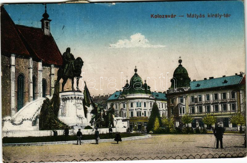 1917 Kolozsvár, Cluj; Mátyás király tér és szobor, Magyar-Francia biztosító / square, monument, insurance company (kis szakadás / small tear)