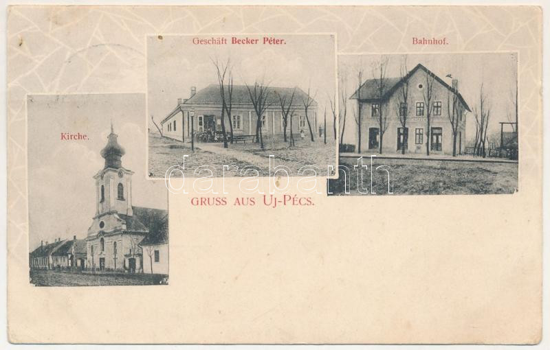 1918 Újpécs, Új-Pécs, Peciu Nou (Temes, Timis); vasútállomás, Becker Péter üzlete, templom / Bahnhof, Geschäft Becker Péter, Kirche / railway station, shop, church. Art Nouveau (EK)