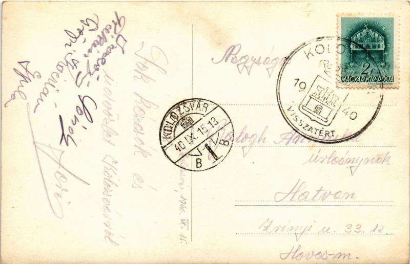 Kolozsvár, Cluj; Szívélyes üdvözlet Kolozsvárról, irredenta propaganda / entry of the Hungarian troops era irredenta propaganda. photo + "1940 Kolozsvár visszatért" So. Stpl. (fl)