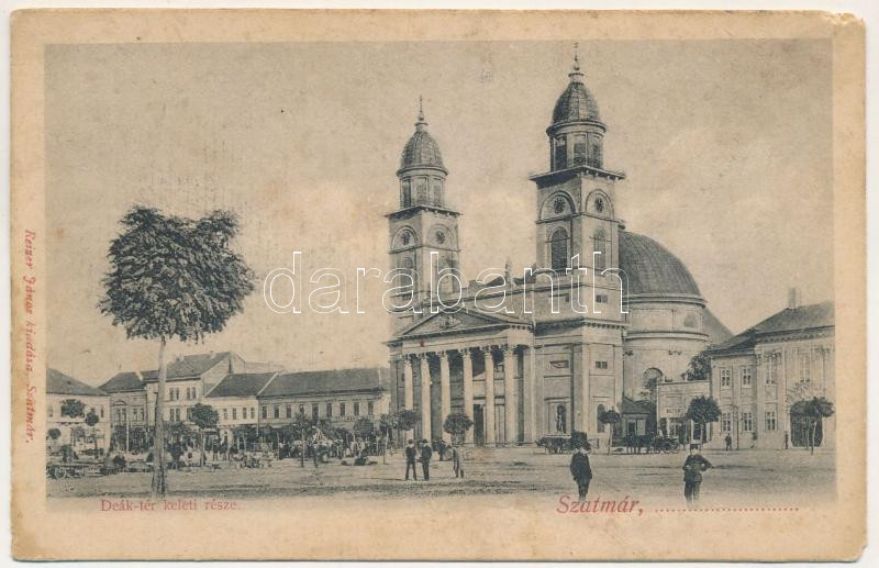 Szatmárnémeti, Szatmár, Satu Mare; Deák tér keleti része, piac, templom, Dellmann Izidor üzlete. Reizer János kiadása / square, market, church (EM)