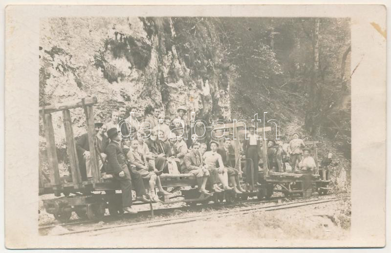 Vaskoh, Vaskóh, Coh, Vascau; erdei vasúti kocsi, bányavasút, iparvasút, kirándulók csoportképe / forest mine railway, industrial railway, hikers' group. photo (fl)