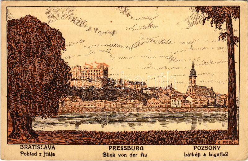Pozsony, Pressburg, Bratislava; Pohlad z Hája / Blick von der Au / Látkép a Ligetből. Pozsonyi műlapok. Druck u. Verlag v. Carl Angermayer Serie V. 11. / general view, art postcard s: K. Frech (EK)